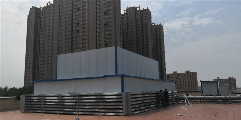 開封 尉氏 建興廣場樓頂布置有兩臺型號為YSPA1150YE的螺桿式風冷熱泵機組。該機組距離近的居民樓25米左右。居民樓為高層建筑。